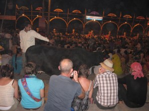 Kaldigimiz otelin hemen yakinindaki ghat olan Dasaswamedh Ghat’i her aksam sergilenen ates dansi duasina ev sahipligi yapiyormus. Bir aksam yakindan onu seyretmeye gittik. Ates gosterisi bir kac degisik atesli ekipmanla, 7-8 kisinin yaptigi, duaya benzer bir sarki ve hipnotize edici bir muzikle izleyenleri buyuleyen bir gosteriydi. Bir hayli de uzun surdu. Toren aslinda Ganj’a karsi yapildigi icin, en iyi aciyi yakalamaya calisan insanlar sandallarda Ganj’a yigilmis ve sahnenin onunde birbirine kenetlenmis haldeydiler. Cok kalabalik olan meydanda her turlu insani bulmak mumkun. Anildiklari isimleri bilemiyorum ama (sadhu olabilir mi?) turuncu kiyafetler ile dilenci ermisler merdiven baslarini tutmuslar dilenmek icin. Merdivenlere her gelir kitlesinden insanlar dizilmis.