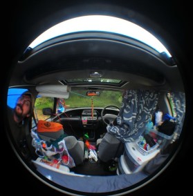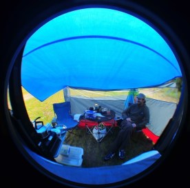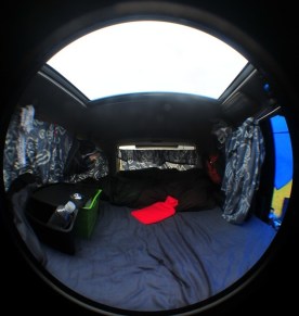 Burasi pek merak edilen yatak kismi. Iste yatak buraya sigiyor! Yildizlara nazirdir, kucumsemeyelim. Kucuk bir ic mekan masamiz (solda goruluyor, zor seciliyor olabilir, hani sise var yaninda), sicak su torbamiz bile var dikkat ederseniz.