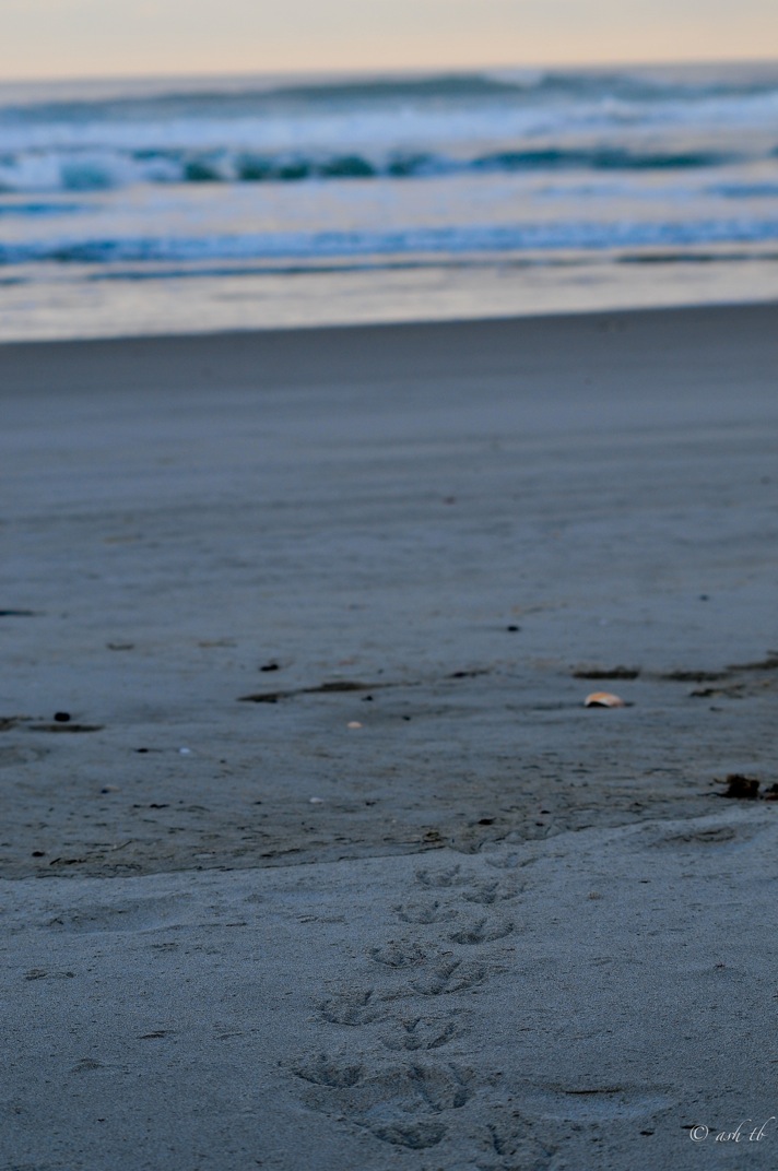 Bu kaygiyla kumlari tararken gozum, ayak izlerine takiliyor. Ayni anda Re’de “suna bak, her neyse bu izleri yapan ayagini suruyor”, diyor :). 3 parmakli, perdeli ayakizleri ve ortadaki parmak bir ondeki izle birlesiyor. Izler kum tepelerine kadar gidip, debelenerek tepecige tirmanip, otlarin arasinda kayboluyor. Yan yana 3 ayri iz goruyoruz boyle ayni tepecigin arkasina giden, kosup gizli gizli bakiyoruz; ustunde debelenilmis otlardan baska birsey yok. Kumsalda yurumeye devam ediyoruz, butun izler denizden kum tepelerine geliyor, hicbiri denize gitmemis bugun. Ama peki nerdeler o zaman, kum tepelerinin arasinda da yoklar?