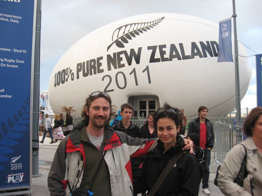 Auckland’da liman tarafina Yeni Zelanda’yi tanitmak uzere yerlestirdikleri rugby topu. Topu kurduklari yerin adi Queen’s Wharf, ayni zaman eglence bolgesi olarak kullanilyordu taraftarlar icin.