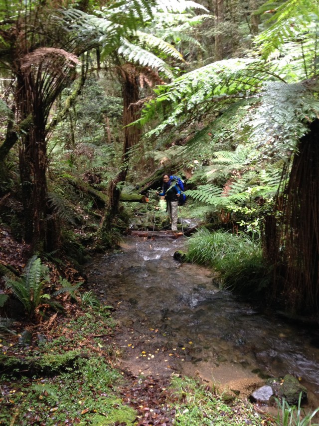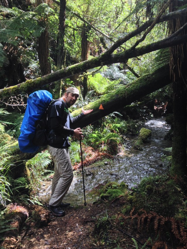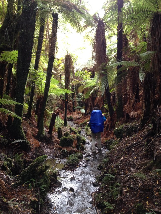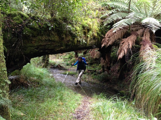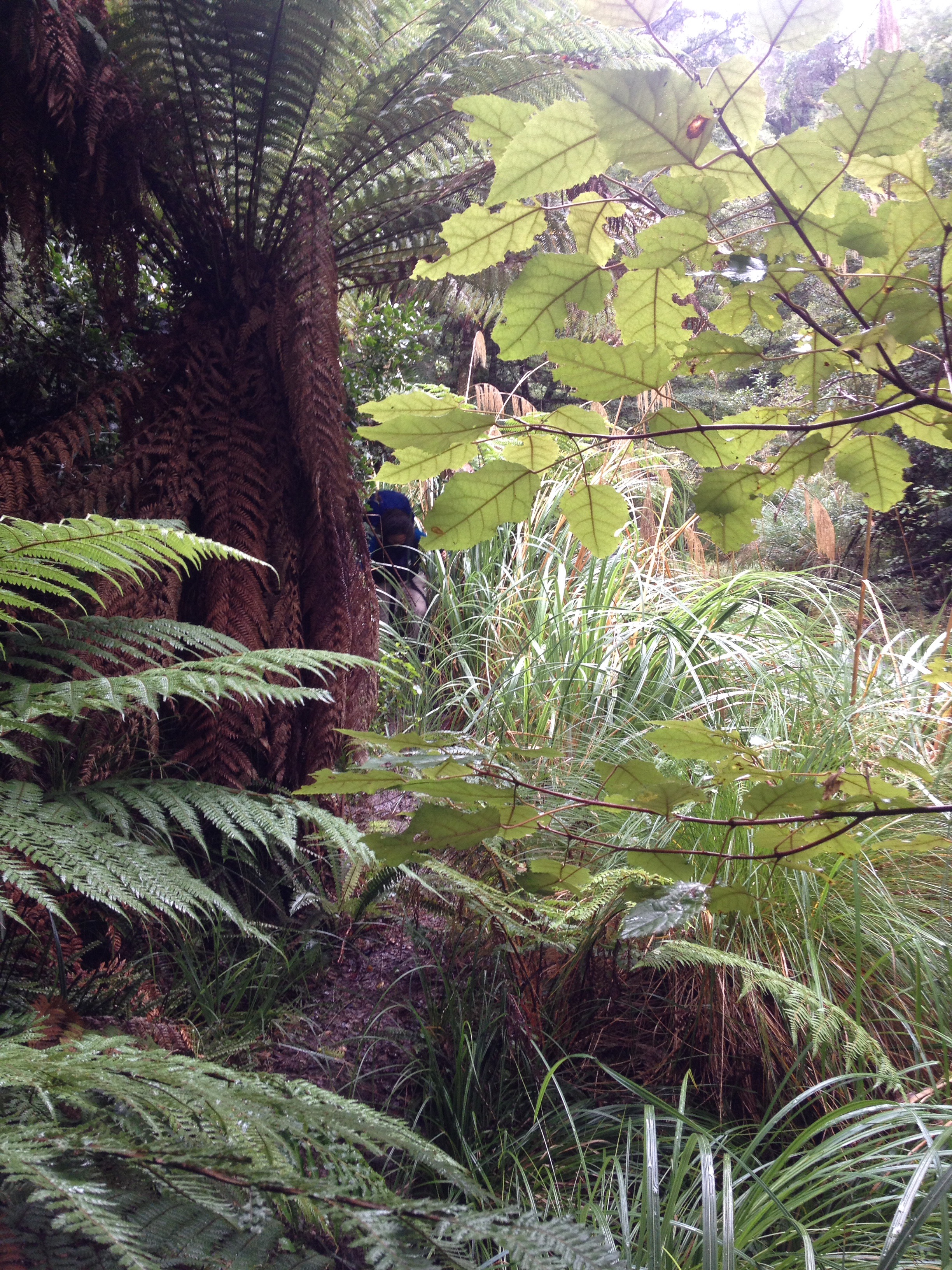 Yarim saat sonra geldik ilk yol ayrimina. Dedim ya, bu rota back country huts diye geciyor, iste ona gore bir yol ayrimi hayal edin. 3-4 kere kontrol etmek zorunda kaldik ana patikadan ayrilip bu yan patikaya girmeden evvel. Ana yol sag tarafa dogru giden guzel bir patika ve tahta kopru iken, yol ayrimi diye bize gosterdigi yol bildigin camurun ve cok siki 2 metrelik bir caliligin ortasi. Patika demeye bin sahit lazim, zaten gorunen bir yol da yok. Cantalarin yagmurlugunu takip daldik araya. Of ne dallardan calilardan islanmamiz kaldi, ne otlardan elimizin kolumuzun kesilmesi. Camura bir basiyorsun sanki bataklik. Cekip cikaramiyorum botlari, her adimda zorlaniyoruz.