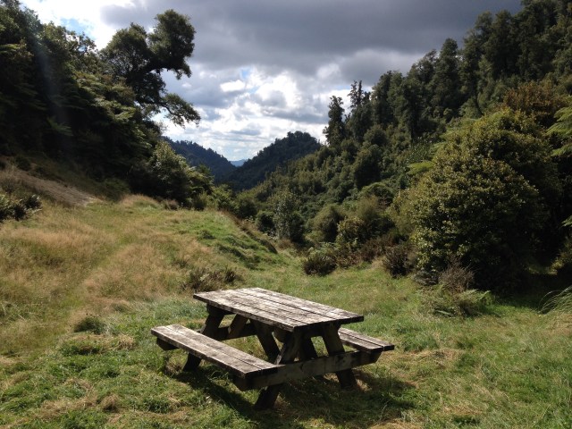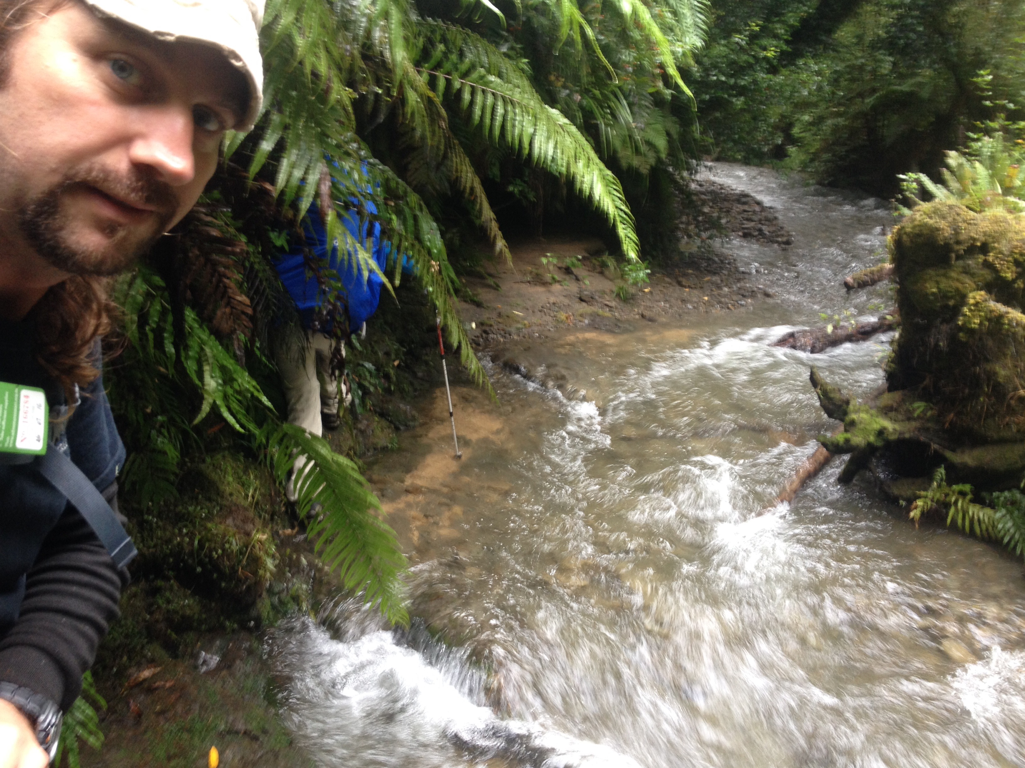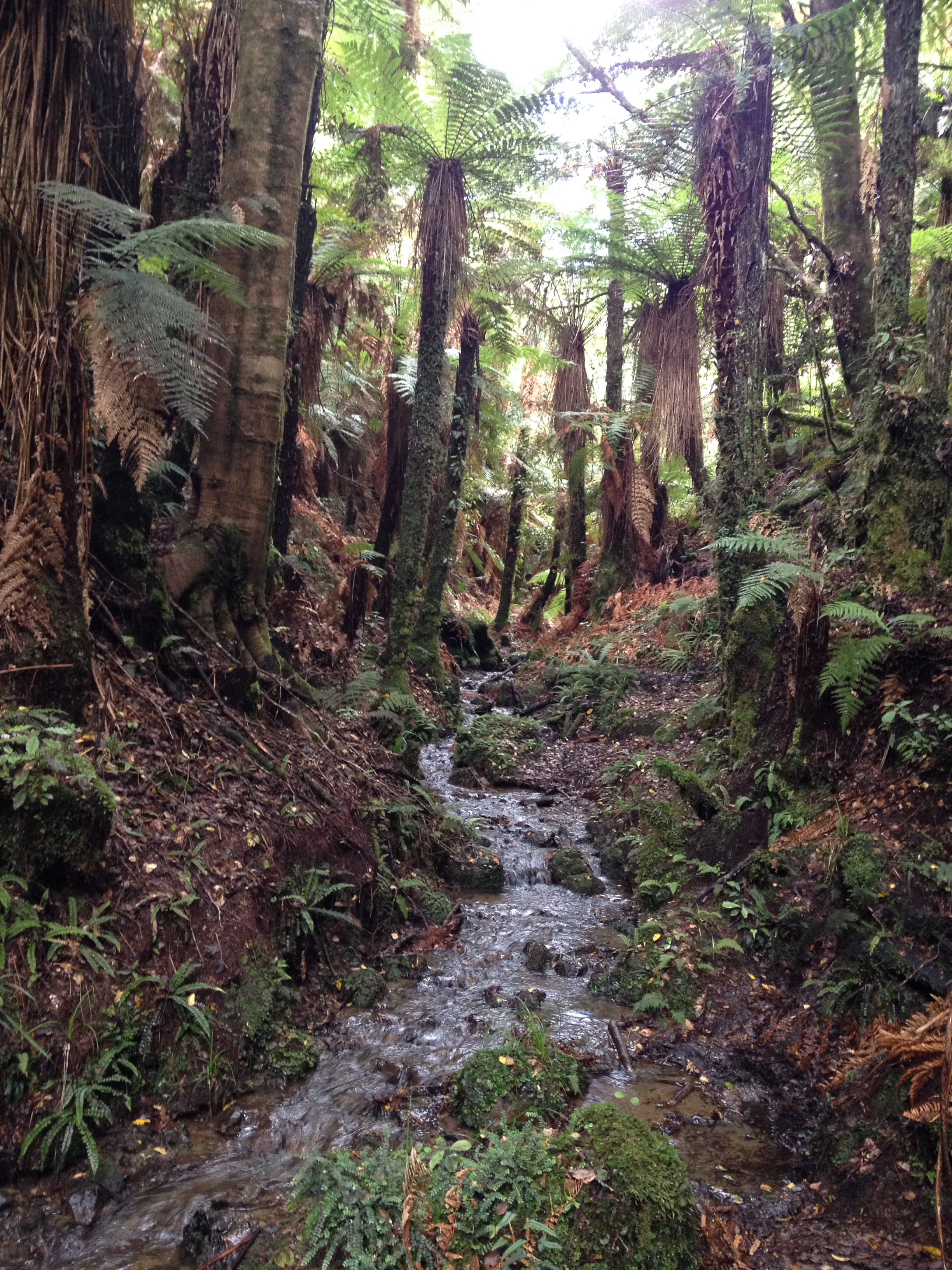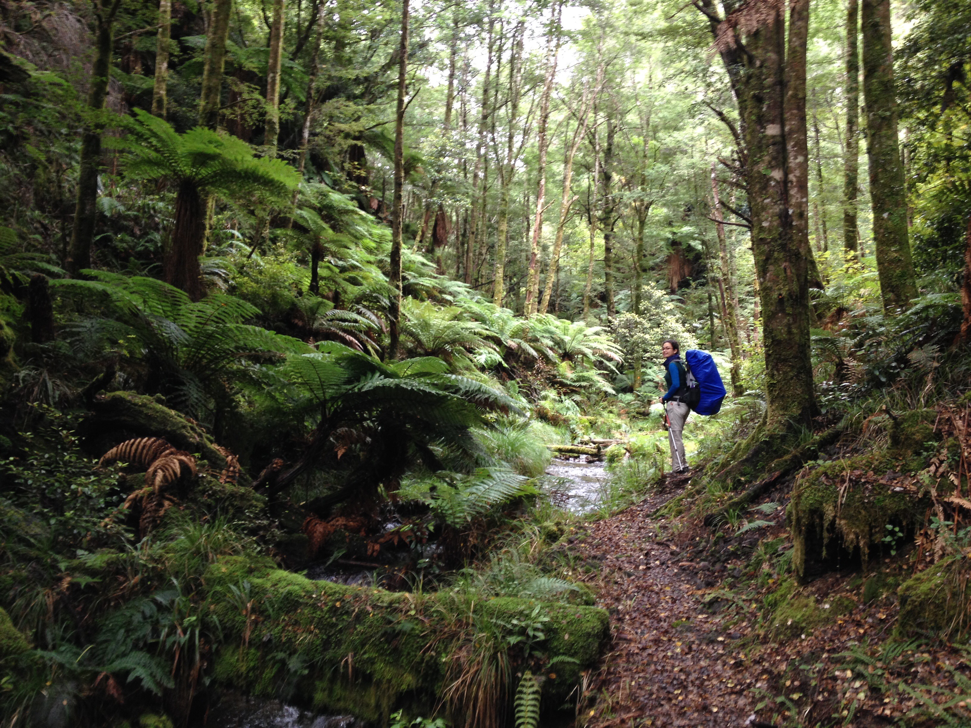 Yarim saat sonra geldik ilk yol ayrimina. Dedim ya, bu rota back country huts diye geciyor, iste ona gore bir yol ayrimi hayal edin. 3-4 kere kontrol etmek zorunda kaldik ana patikadan ayrilip bu yan patikaya girmeden evvel. Ana yol sag tarafa dogru giden guzel bir patika ve tahta kopru iken, yol ayrimi diye bize gosterdigi yol bildigin camurun ve cok siki 2 metrelik bir caliligin ortasi. Patika demeye bin sahit lazim, zaten gorunen bir yol da yok. Cantalarin yagmurlugunu takip daldik araya. Of ne dallardan calilardan islanmamiz kaldi, ne otlardan elimizin kolumuzun kesilmesi. Camura bir basiyorsun sanki bataklik. Cekip cikaramiyorum botlari, her adimda zorlaniyoruz.