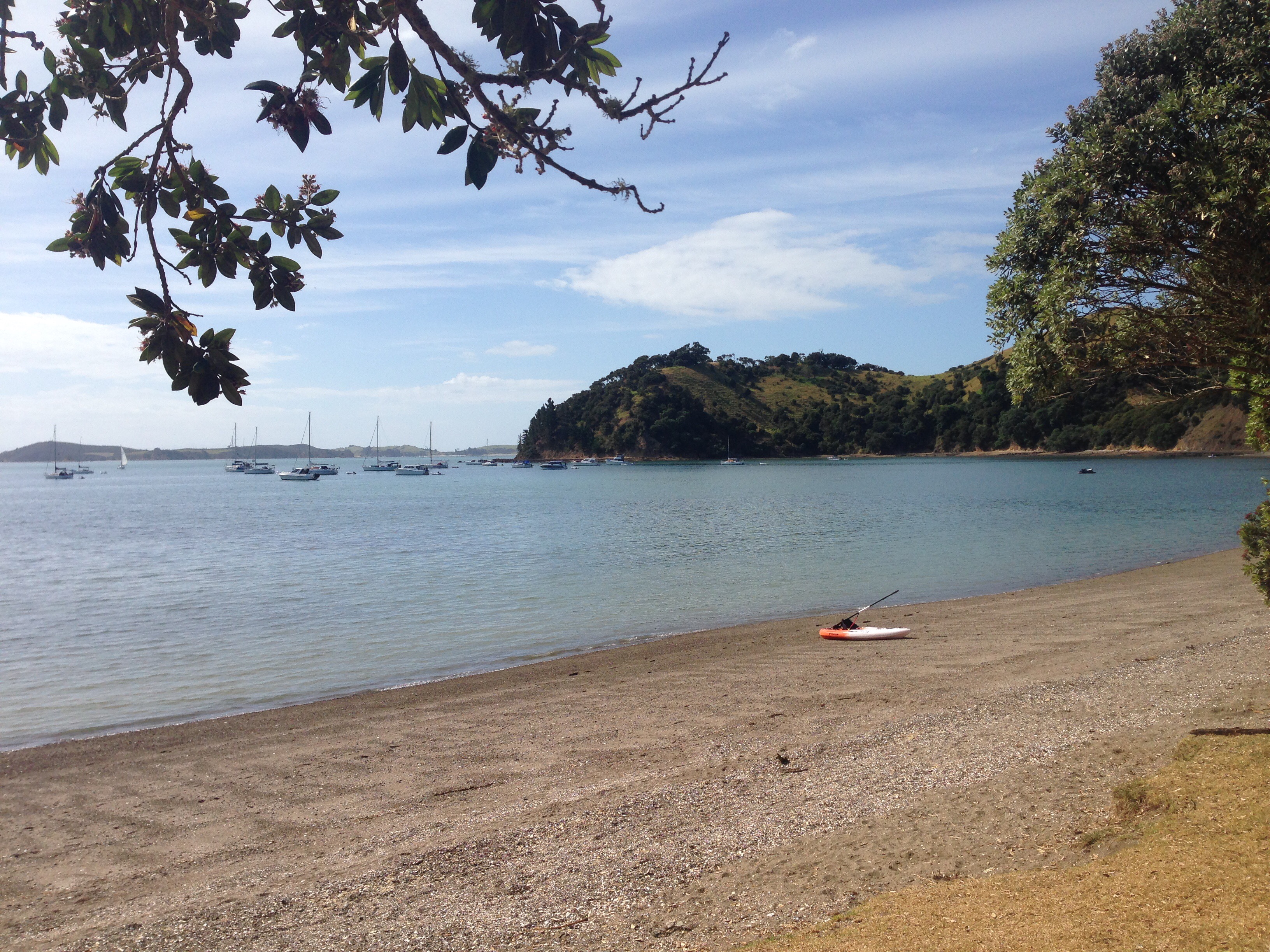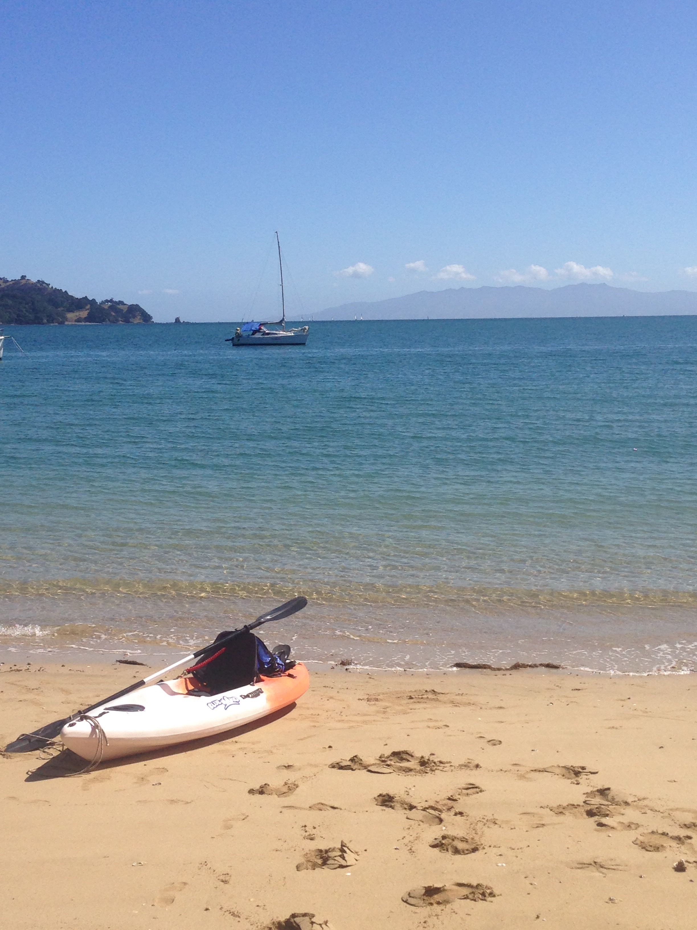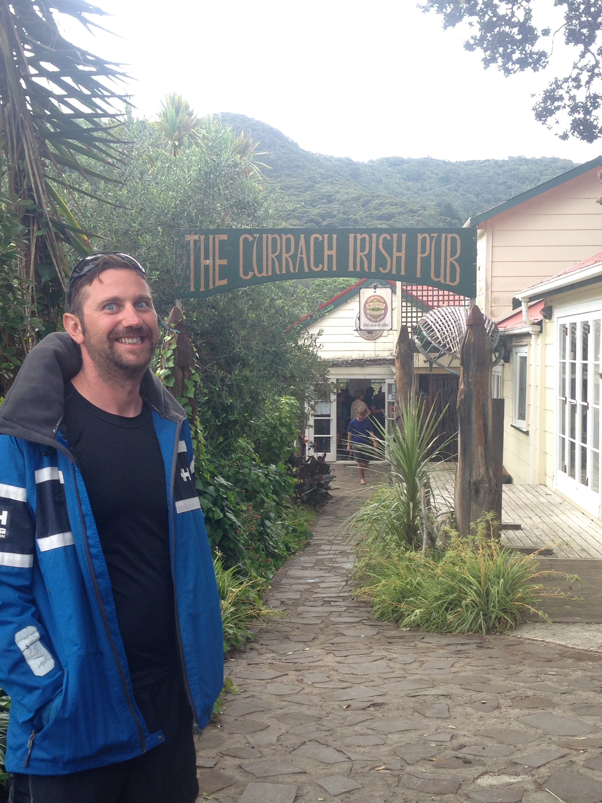 Daha sonra da oradan ayrilip Tryphena Limani’na dogru yola ciktik, gece kalmak uzere. Liman’da koylari tek tek motorla gezip sig bir tanesinde demir attik. Tek kisilik kayagimiza iki kisi atladik yine ve devrilmemeye dikkat ederek sahile ciktik. Tryphena’nin kumsali bizi bir hayli etkiledi dogrusu. Upuzun acik renkli kumsal ve berrak deniz, davet edici bir tatil semti imajina burunduruyor bu liman kasabasini. Pek begendik :). Tek caddesindeki 3 dukkandan birisi de Irish pub olunca hemen elimize birer guinness yapisiverdi.