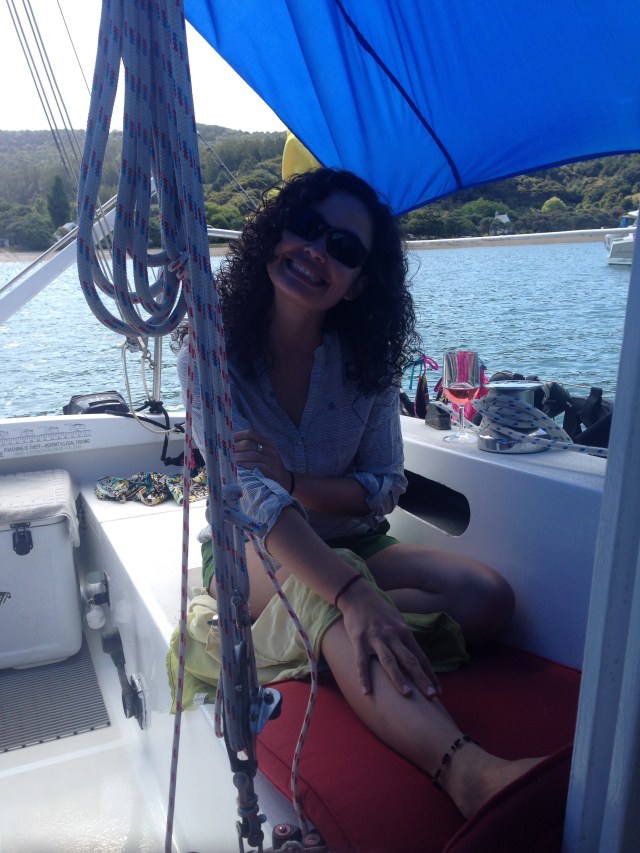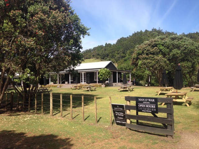 Buyuk kutlama icin Man O’ War koyuna motorla gittik. Demir atip herseyin guvende olduguna emin olunca da dogru sarap evine yollandik. Tabi 1 sandal 2 fil fikrasi yine :). Yanimizdaki su almaz cantaya cici kiyafetler ve cuzdan koyup, nerdeyse tamamen su almis kayagimizla sahile cikip bir agac arkasinda giyiniyoruz yine. Sonra da sarap evine butun asaletimizle giriyoruz sanki 3 gundur dus almayan ben degilmisim gibi.